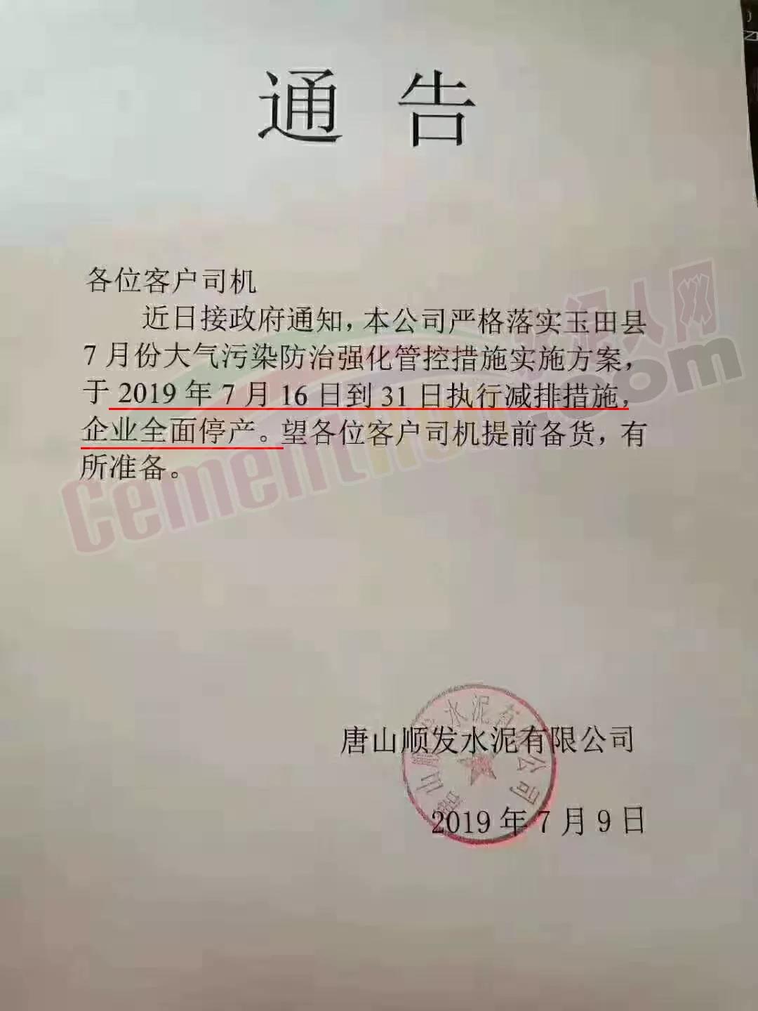 唐山順發(fā)水泥有限公司通知稱:近日接到政府通知,本公司嚴(yán)格落實(shí)玉田縣7月份大氣污染防治強(qiáng)化管控措施實(shí)施方案,于2019年7月16日到31日執(zhí)行減排措施,企業(yè)全面停產(chǎn)。望各位客戶司機(jī)提前備貨,有所準(zhǔn)備。