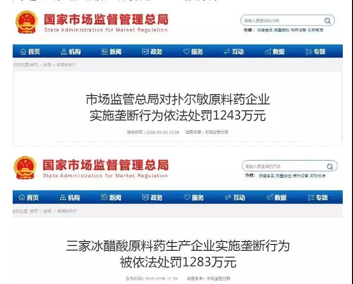 今年年初市場監(jiān)管總局開出了今年的首張罰單:1月9日,撲爾敏原料藥企業(yè)湖南爾康醫(yī)藥和河南九勢制藥就因違反反壟斷法規(guī)定,兩家企業(yè)共被判罰1243.14萬元。去年12月6日,三家冰醋酸原料藥生產(chǎn)企業(yè)也因壟斷行為被處罰:沒收違法所得及罰款共計1283.38萬元。這一處罰也被媒體稱作原料藥領(lǐng)域反壟斷的最大罰單。