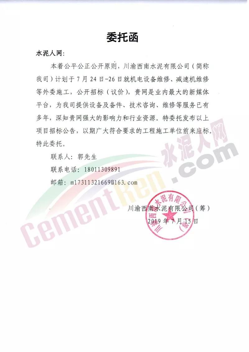 川渝西南公司擬對(duì)下屬的四川區(qū)域、重慶區(qū)域39家熟料、水泥生產(chǎn)企業(yè),進(jìn)行2019年度機(jī)電設(shè)備維修、減速機(jī)維修等外委施工招議標(biāo),通過(guò)公開(kāi)邀請(qǐng)招標(biāo)選擇資質(zhì)合格、保供能力強(qiáng)、質(zhì)量及技術(shù)服務(wù)均受控的供貨單位?,F(xiàn)將相關(guān)招標(biāo)采購(gòu)信息發(fā)布如下: