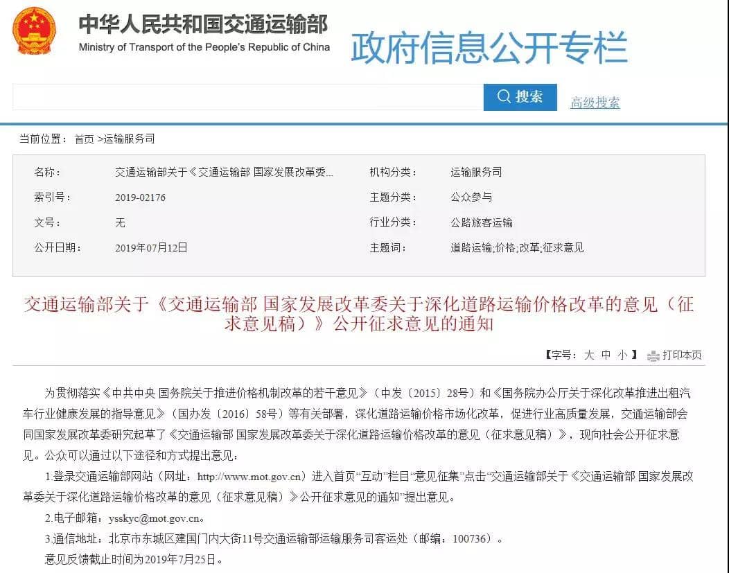 7月12日交通運輸部官網發(fā)布《交通運輸部國家發(fā)展改革委關于深化道路運輸價格改革的意見(征求意見稿)》其中提到深化道路運輸價格市場化改革,促進行業(yè)高質量發(fā)展,交通運輸部會同國家發(fā)展改革委研究起草了《交通運輸部 國家發(fā)展改革委關于深化道路運輸價格改革的意見(征求意見稿)》其改革目標為到2020年,道路運輸競爭性領域和環(huán)節(jié)價格基本放開,保留實行政府定價、政府指導價的道路運輸價格動態(tài)調整機制有效建立,道路客運、出租汽車等領域經營者價格行為更加規(guī)范,主要由市場決定的道路運輸價格形成機制和科學、規(guī)范、透明的道路運輸價格監(jiān)管制度基本健全,價格機制引導資源配置、促進行業(yè)高質量發(fā)展、滿足人民群眾出行需求的作用明顯增強。上述意見自2019年11月1日起實行。