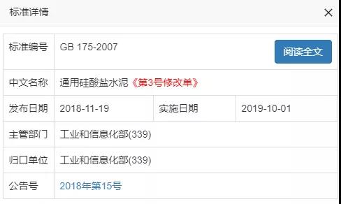 中華人民共和國國家標準公告(2018年第15號)《GB175-2007通用硅酸鹽水泥(第3號修改單)》是由國家市場監(jiān)督管理總局、國家標準化管理委員會批準自2019年10月1日起正式實施的。3號修改單的主要內容是“全面取消32.5復合硅酸鹽水泥”。