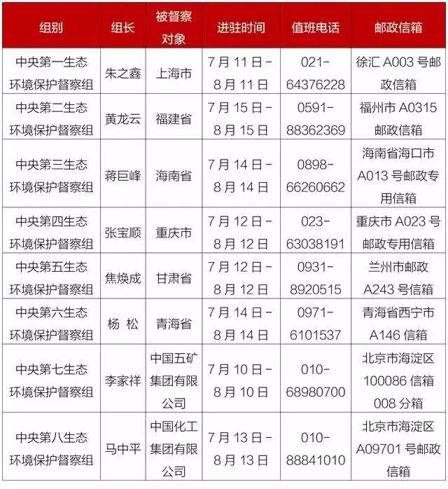 第二輪第一批中央生態(tài)環(huán)境保護督察進駐一覽表