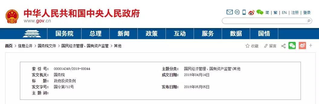日前,國務院總理李克強簽署國務院令,公布《政府投資條例》,自2019年7月1日起施行。《條例》明確界定政府投資范圍,政府投資資金應當投向市場不能有效配置資源的公共領域項目,以非經營性項目為主;國家建立政府投資范圍定期評估調整機制,不斷優(yōu)化政府投資方向和結構。