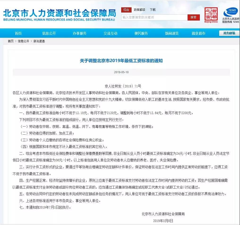 5月,北京市人力資源和社會保障局發(fā)布《關于調整北京市2019年最低工資標準的通知》。7月1日起,北京市最低工資標準由每小時不低于12.18元、每月不低于2120元,調整到每小時不低于12.64元、每月不低于2200元。
