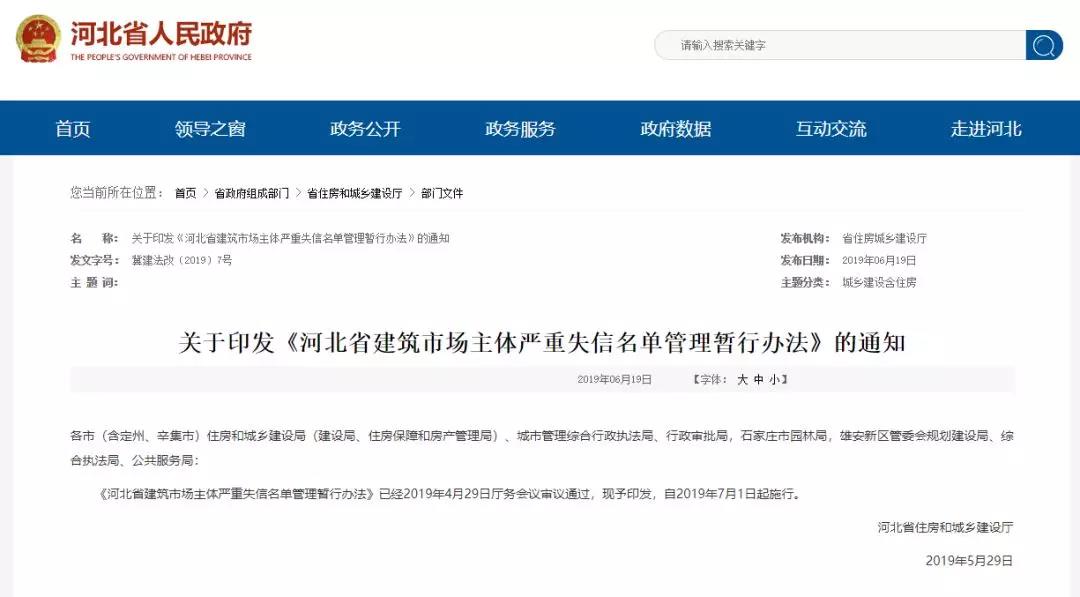 7月1日起河北將施行《河北省建筑市場主體嚴重失信名單管理暫行辦法》
