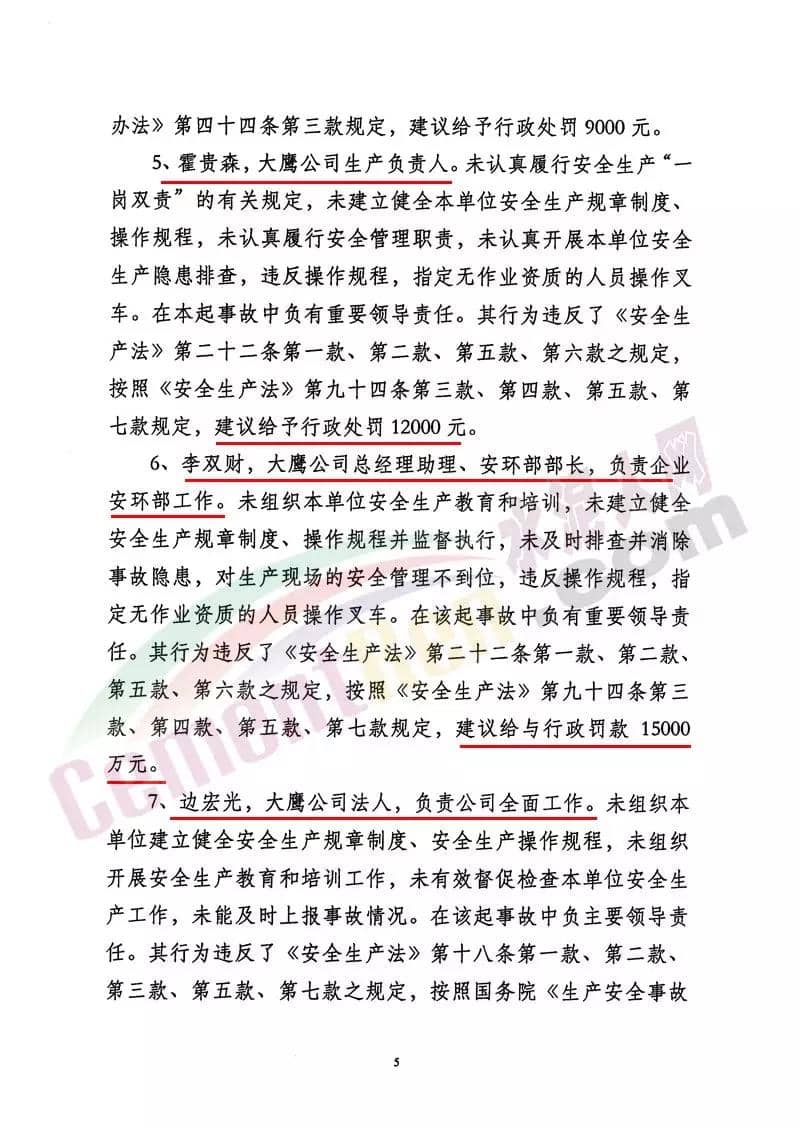 因事故主要責(zé)任人劉某違反《安全生產(chǎn)法》第一百零四條規(guī)定,建議移交司法機(jī)關(guān)處理。陳某,違章指揮,指定沒(méi)有叉車作用資質(zhì)的劉某違章作業(yè),是本起事故的主要責(zé)任人,其行業(yè)違反《安全生產(chǎn)法》第一百零四條規(guī)定,建議移交司法機(jī)關(guān)處理。其他相關(guān)人員,處以行政處罰15000-7000元不等,負(fù)責(zé)企業(yè)全面工作的企業(yè)法人建議給予其上一年年收入的60%行政罰款。阜新市大鷹水泥因企業(yè)安全生產(chǎn)主體責(zé)任落實(shí)不到位等違反了《安全生產(chǎn)法》相關(guān)規(guī)定,依據(jù)相關(guān)條例規(guī)定,建議給予合并行政罰款140萬(wàn)元。