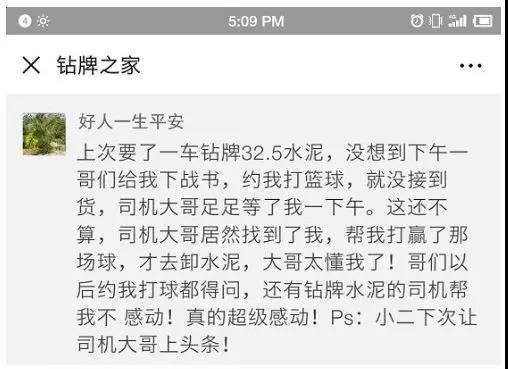 “好人一生平安”留言稱,說他因為打球耽誤了收貨,司機大哥不僅等著他,還幫他打贏了球賽,才去卸水泥,哥們以后約我打球都問,還有鉆牌水泥的司機幫忙嗎,真的超級感動。