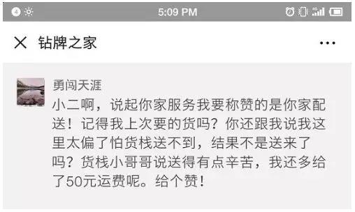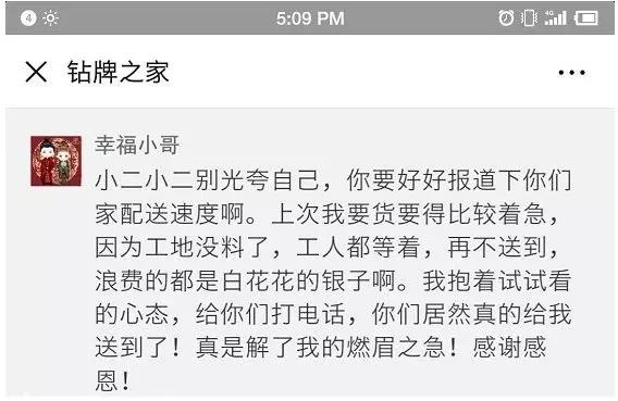 “幸福小哥”則留言稱,對鉆牌之家配送速度相當滿意。確實,如果工人等著干活,卻沒有材料是一件很捉急的事情,給鉆牌之家打電話,居然真的送到了,真是雪中送炭。