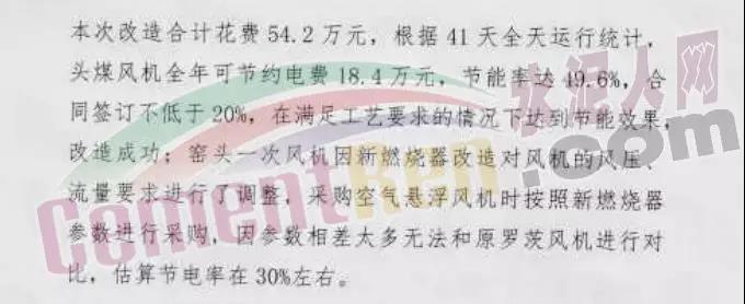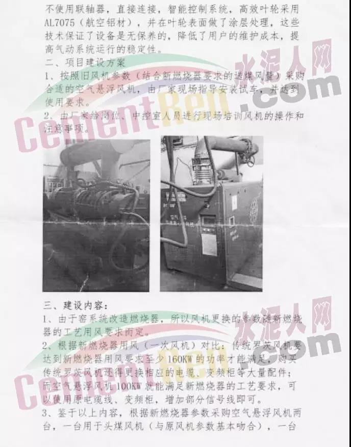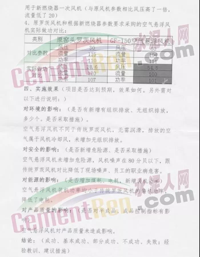 2、窯頭空氣懸浮風(fēng)機(jī):因燃燒器改造后風(fēng)壓要求高于原燃燒器一倍,訂購空氣懸浮風(fēng)機(jī)時按照新燃燒器設(shè)計(jì)參數(shù)采購,對比實(shí)際參數(shù)做功時按照空氣懸浮風(fēng)機(jī)風(fēng)壓、流量接近于原羅茨風(fēng)機(jī)進(jìn)行,上圖中標(biāo)黃數(shù)據(jù)為接近原羅茨風(fēng)機(jī)的參數(shù)和用電量;根據(jù)對比節(jié)電率為30.5%,達(dá)到合同簽訂要求。