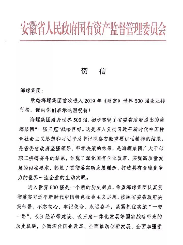 安徽省人民政府網(wǎng)、安徽日報、人民網(wǎng)安徽、中新社安徽、中安在線等主流媒體紛紛發(fā)布海螺進(jìn)入世界500強(qiáng)消息報道。安徽省國資委專門向海螺集團(tuán)致賀信。