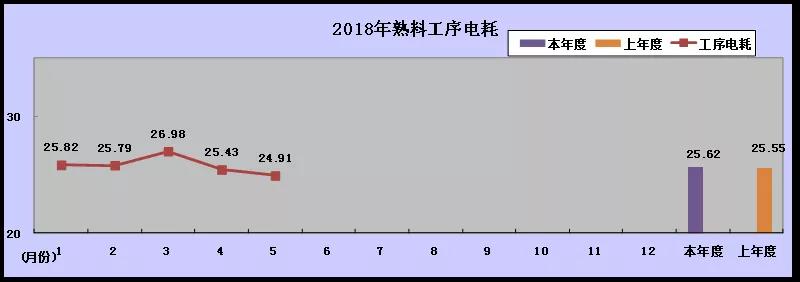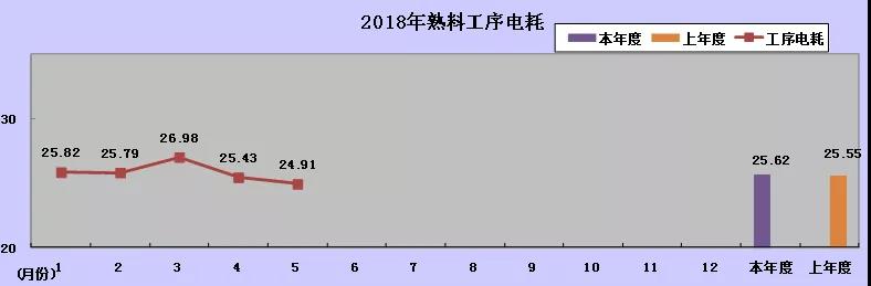 上圖為2018年1-5月熟料工序電耗趨勢圖。5月4日計(jì)劃停窯更換燃燒器,熟料工序電耗24.91kw.h/t,比之前的25.5kw.h/t下降約0.6kw.h/t。主要原因:一、新燃燒器采用了高風(fēng)壓低風(fēng)量技術(shù);二、新燃燒器火焰鋼性足,熟料燒結(jié)好,熟料顆粒均勻,篦冷機(jī)風(fēng)機(jī)群可以降風(fēng),電耗有所下降。