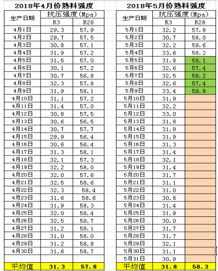 下圖分別為2018年4月和5月出窯熟料強(qiáng)度: