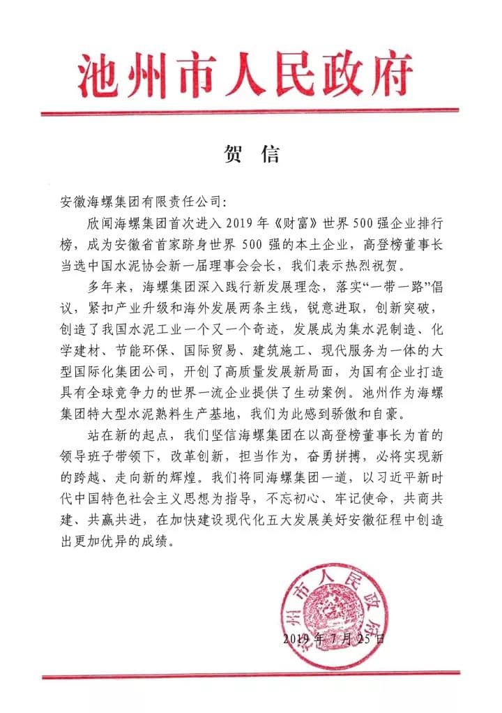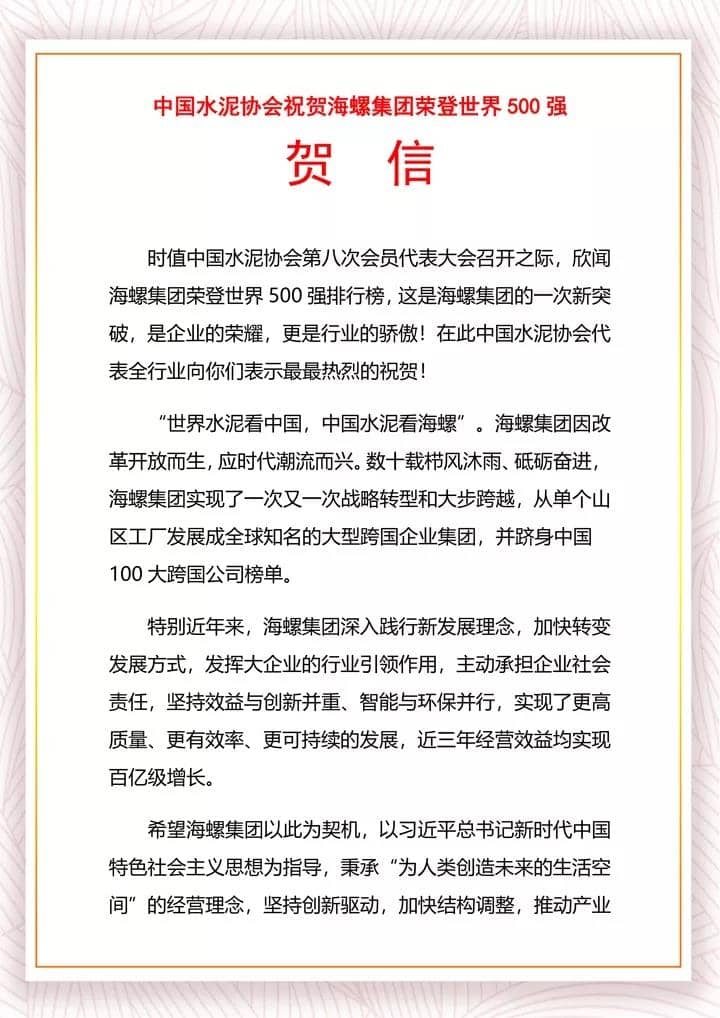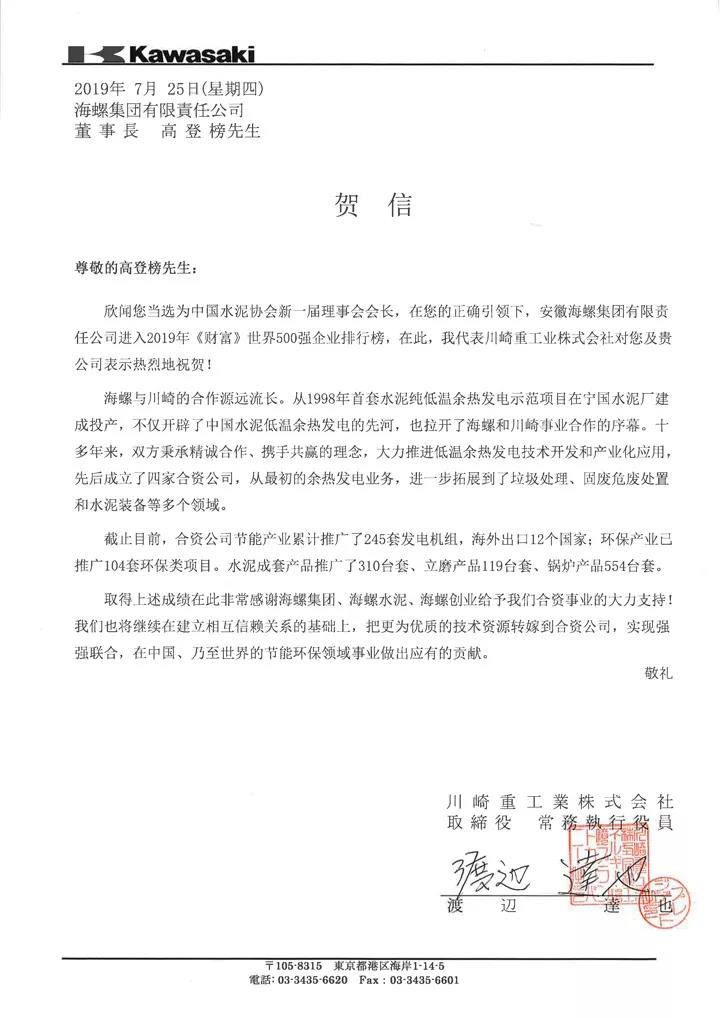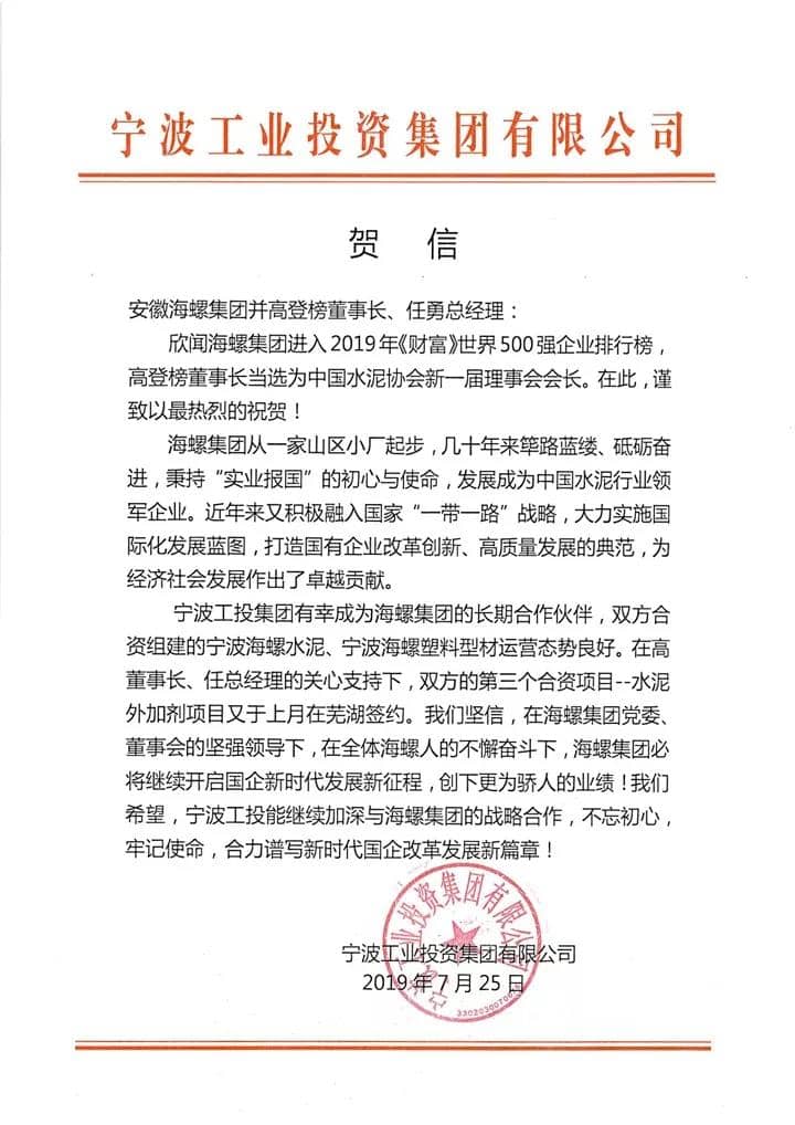 近日,池州市人民政府,中國(guó)建筑材料聯(lián)合會(huì)、中國(guó)水泥協(xié)會(huì),泛太平洋集團(tuán)、三一集團(tuán)、日本川崎重工等企業(yè)向海螺集團(tuán)發(fā)來賀信。