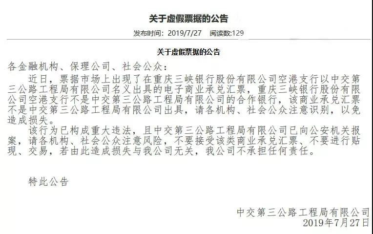 近日,票據(jù)市場上出現(xiàn)了重慶三峽銀行股份有限公司空港支行以中交第三公路工程局有限公司名義出具的電子商業(yè)承兌匯票,重慶三峽銀行股份有限公司空港支行不是中交第三公路工程局有限公司的合作銀行,該商業(yè)承兌匯票不是中交第三公路工程局有限公司出具,請各機構、社會公眾注意識別,以免造成損失。