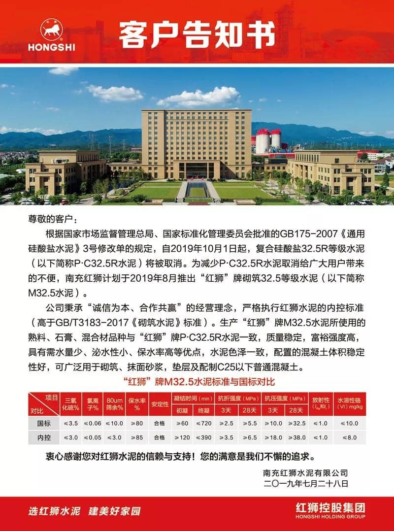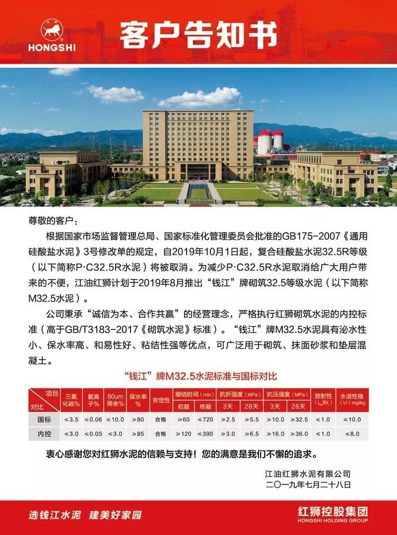 塔牌企業(yè)告用戶告知書(shū)稱(chēng),為滿足廣大用戶對(duì)取消32.5R復(fù)合硅酸鹽水泥后的使用需求,綜合市場(chǎng)反饋意見(jiàn),塔牌集團(tuán)在原已經(jīng)生產(chǎn)P·P32.5R(火山灰質(zhì)硅酸鹽水泥)基礎(chǔ)上,于近期逐步向市場(chǎng)推出M32.5(砌筑水泥)及P·C42.5(復(fù)合硅酸鹽水泥)。