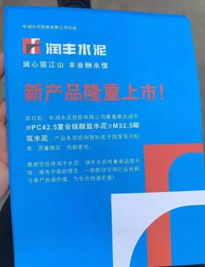 華潤水泥控股有限公司新品宣傳海報(bào)稱,即日起,華潤水泥控股有限公司隆重推出潤豐牌P.C42.5復(fù)合硅酸鹽水泥及M32.5砌筑水泥,產(chǎn)品各項(xiàng)控制指標(biāo)優(yōu)于國家現(xiàn)行標(biāo)準(zhǔn),質(zhì)量穩(wěn)定,性能更優(yōu)。