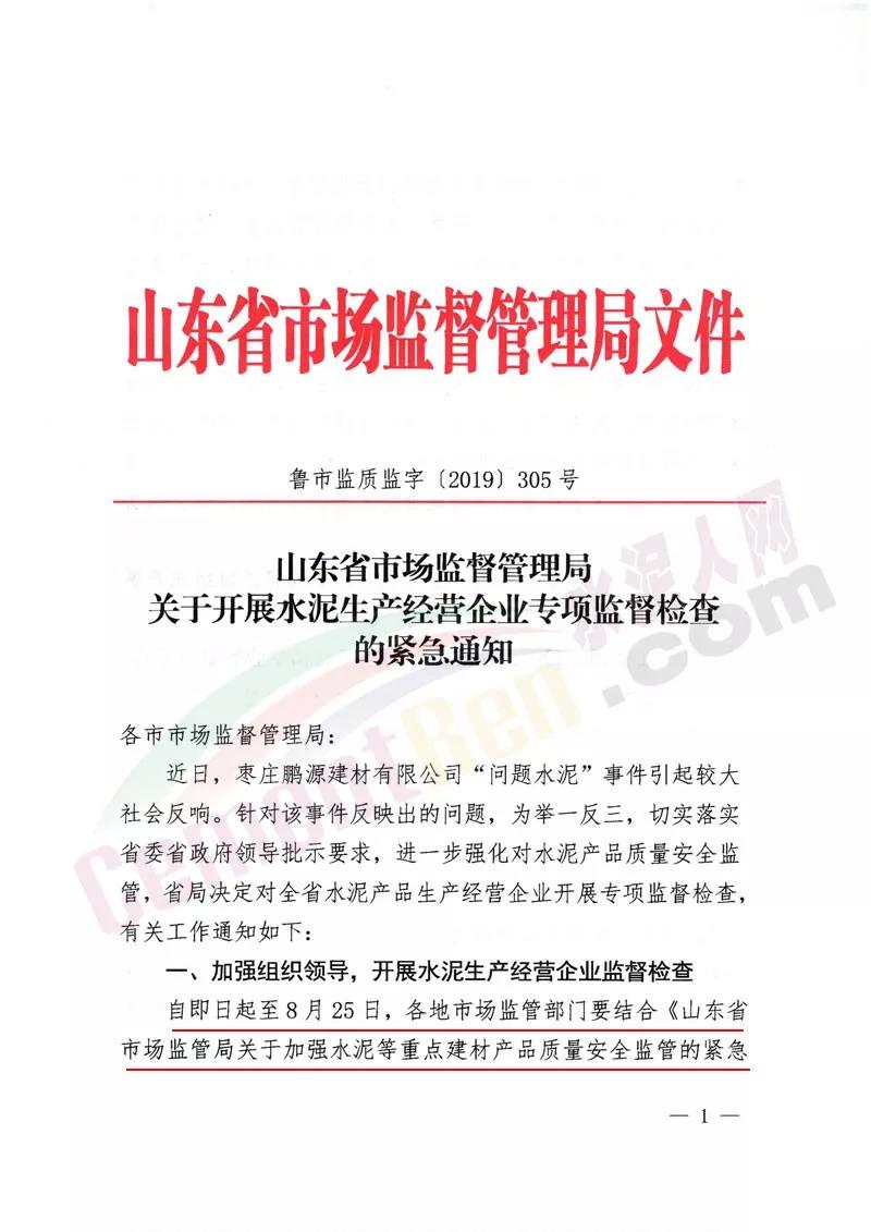 據(jù)水泥人網(wǎng)了解,山東各地的通知源于2019年7月29日的一份通知。通知稱:自即日起至8月25日,各地市場監(jiān)管部門要結合《山東省市場監(jiān)管局關于加強水泥等重點建材產(chǎn)品質量安全監(jiān)管的緊急通知》(局函(2019)240號)要求,加強領導,組織力量對轄區(qū)內全部水泥產(chǎn)品獲證企業(yè)開展一次專項監(jiān)督檢查。