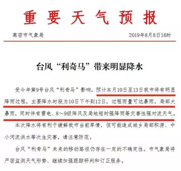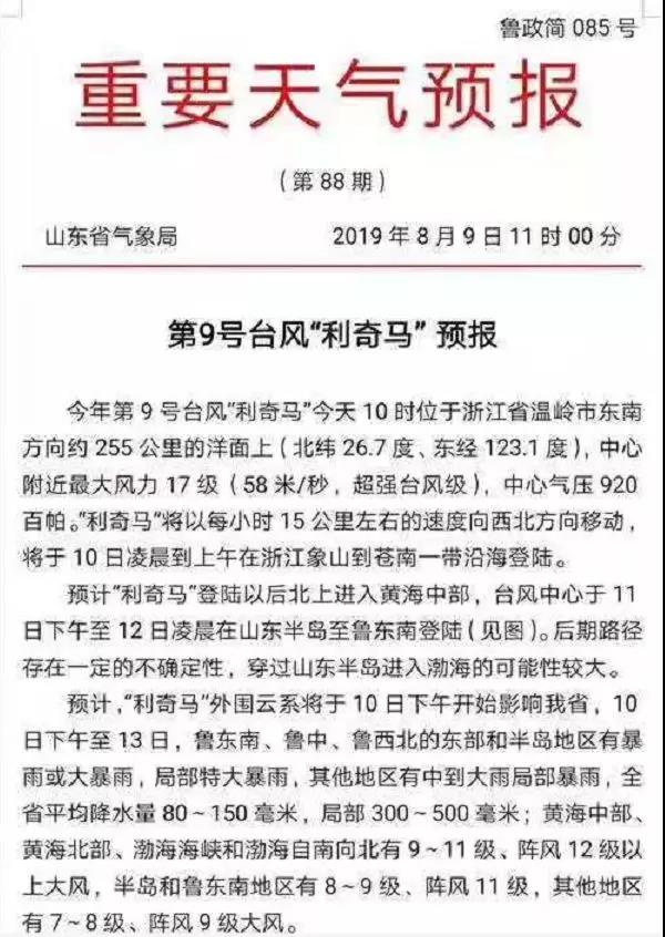 山東省氣象局發(fā)布第9號臺風(fēng)“利奇馬”預(yù)報稱,預(yù)計臺風(fēng)中心于11日下午至12日凌晨在山東半島至魯東南登陸。后期路徑存在一定的不確定性,穿過山東半島進入渤海的可能性較大。預(yù)計“利奇馬”外圍 云“系于10日下午開始影響山東省。
