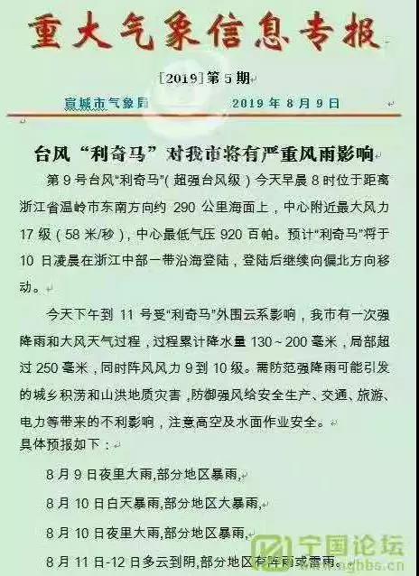 8月9日宣城市氣象局發(fā)布重大氣象信息專報稱,第9號臺風(fēng)“利奇馬”(超強臺風(fēng))今天早晨8時位于距離浙江省溫嶺市東南方向約290公里海面上,中心附近最大風(fēng)力17級(58米/秒),中心最低氣壓920百帕。9日下午至11日受“利奇馬”外圍 云系影響,宣城市有一次強降雨和大風(fēng)天氣過程。需防范強降雨可能引發(fā)的城鄉(xiāng)積澇和山洪地質(zhì)災(zāi)害,防御強風(fēng)給安全生產(chǎn)、交通、旅游、電力等帶來的不利影響,需注意高空及水面作用安全。