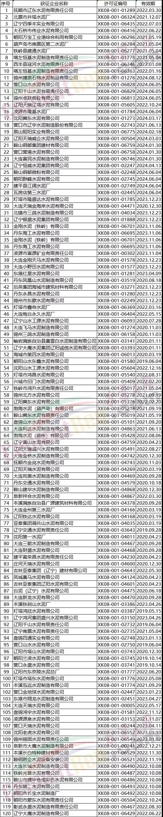 遼寧部分水泥企業(yè)名單