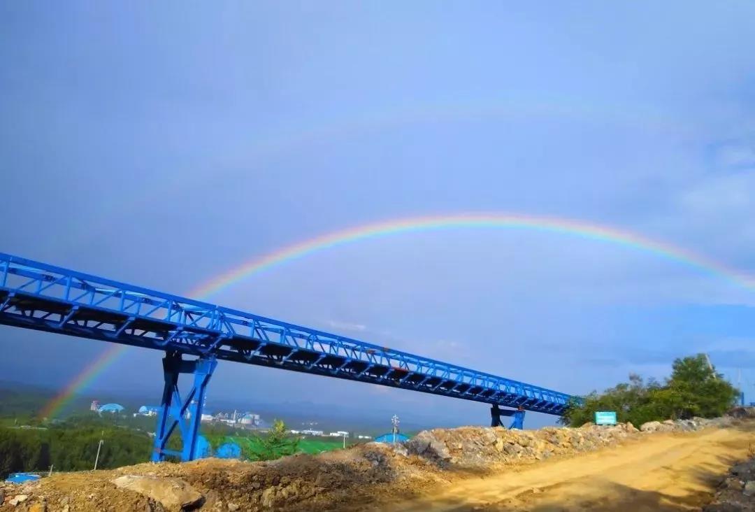 8月7日,七夕傍晚,鋼鐵鵲橋在叢林中穿梭,彩虹祥瑞相伴天際。這是天瑞南召水泥骨料線項(xiàng)目制作安裝完成的121-BC04,350米一體化廊道,雄壯威武。