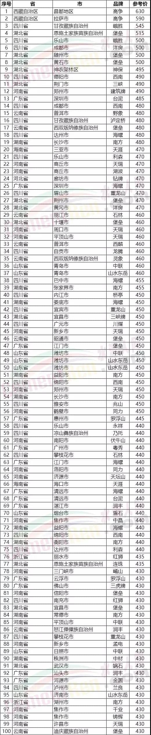 從水泥人網(wǎng)信息中心監(jiān)管的近400家PC32.5R包裝水泥價格數(shù)據(jù)來看, 報價最高區(qū)域仍為西藏區(qū)域,其中昌都高爭水泥報價630元/噸,最低報價為貴州黔南布依族苗族自治海螺水泥及內(nèi)蒙古自治區(qū)包頭市東方希望水泥報價210元/噸。