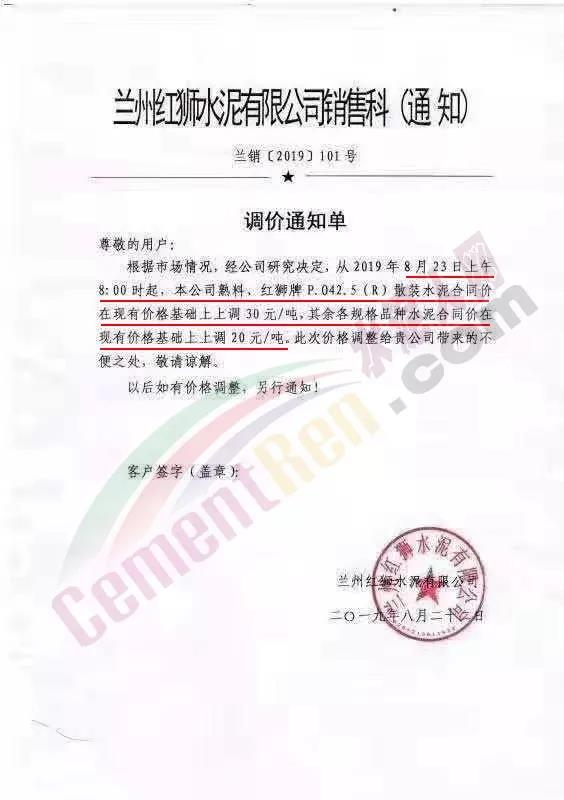 中材甘肅水泥有限責(zé)任公司《關(guān)于調(diào)整水泥銷售價(jià)格的通知》稱自2019年8月22日零時(shí)起對(duì)各品種水泥在現(xiàn)有價(jià)格基礎(chǔ)上上調(diào)30元/噸。