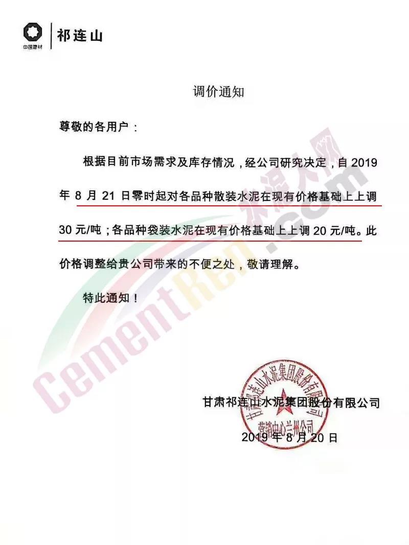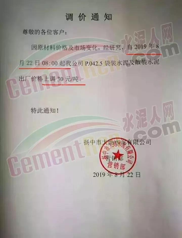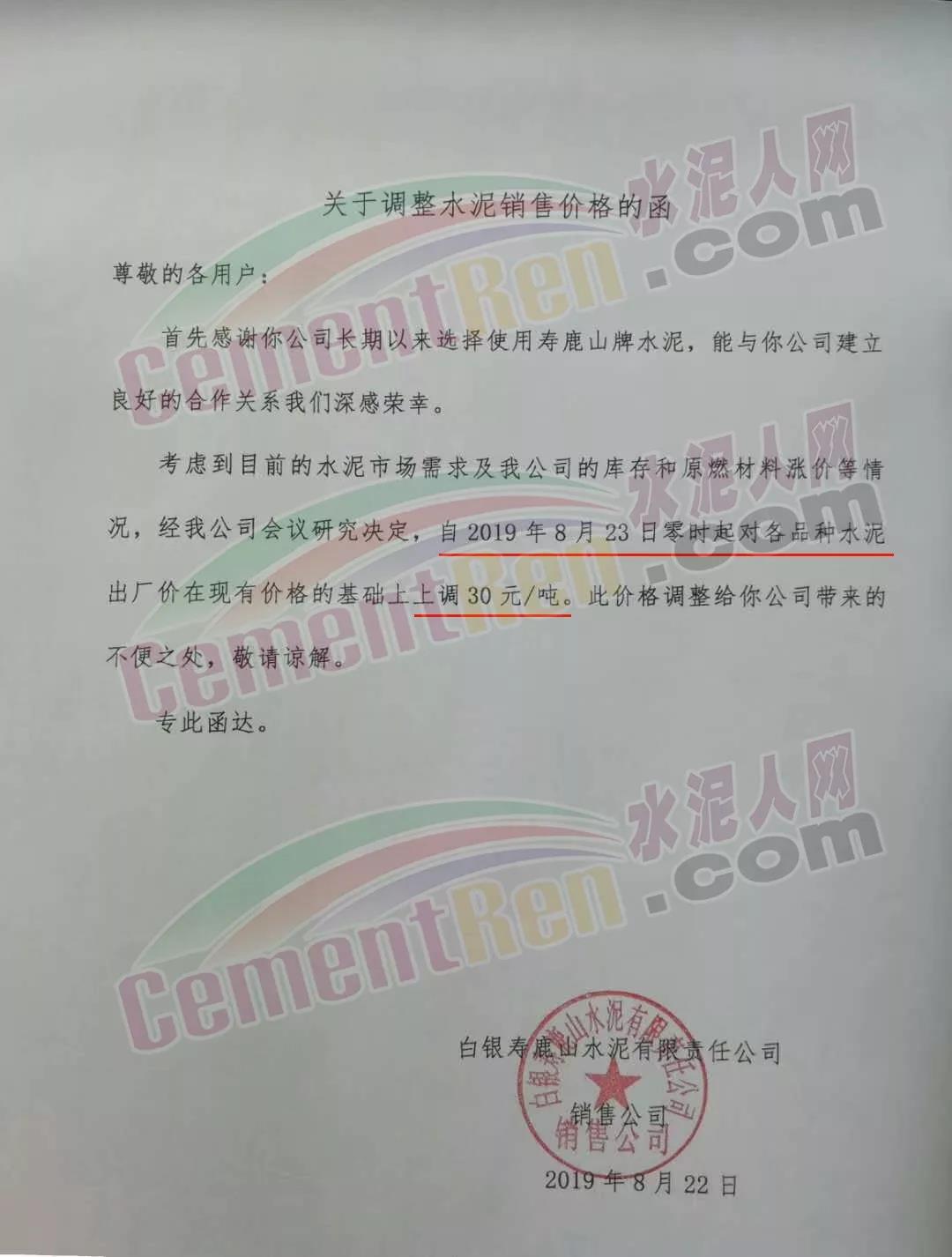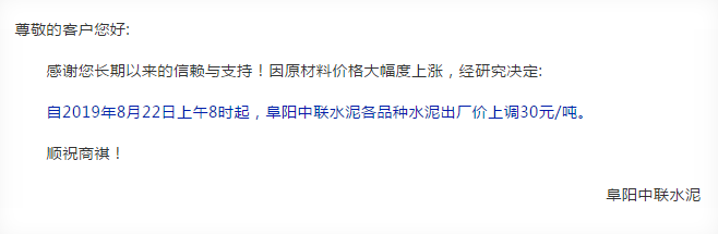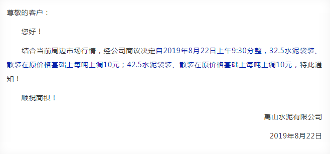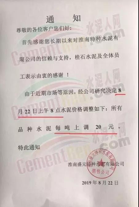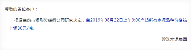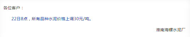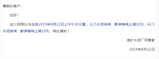 水泥人網(wǎng)通訊員消息:昨日(8月22日),皖北主導企業(yè),相山海螺,宿州海螺,蕭縣天瑞等企業(yè)通知水泥價格在原價基礎上上調(diào)30元/噸。區(qū)域內(nèi)其他也企業(yè)陸續(xù)跟漲,部分企業(yè)的通知函如下: