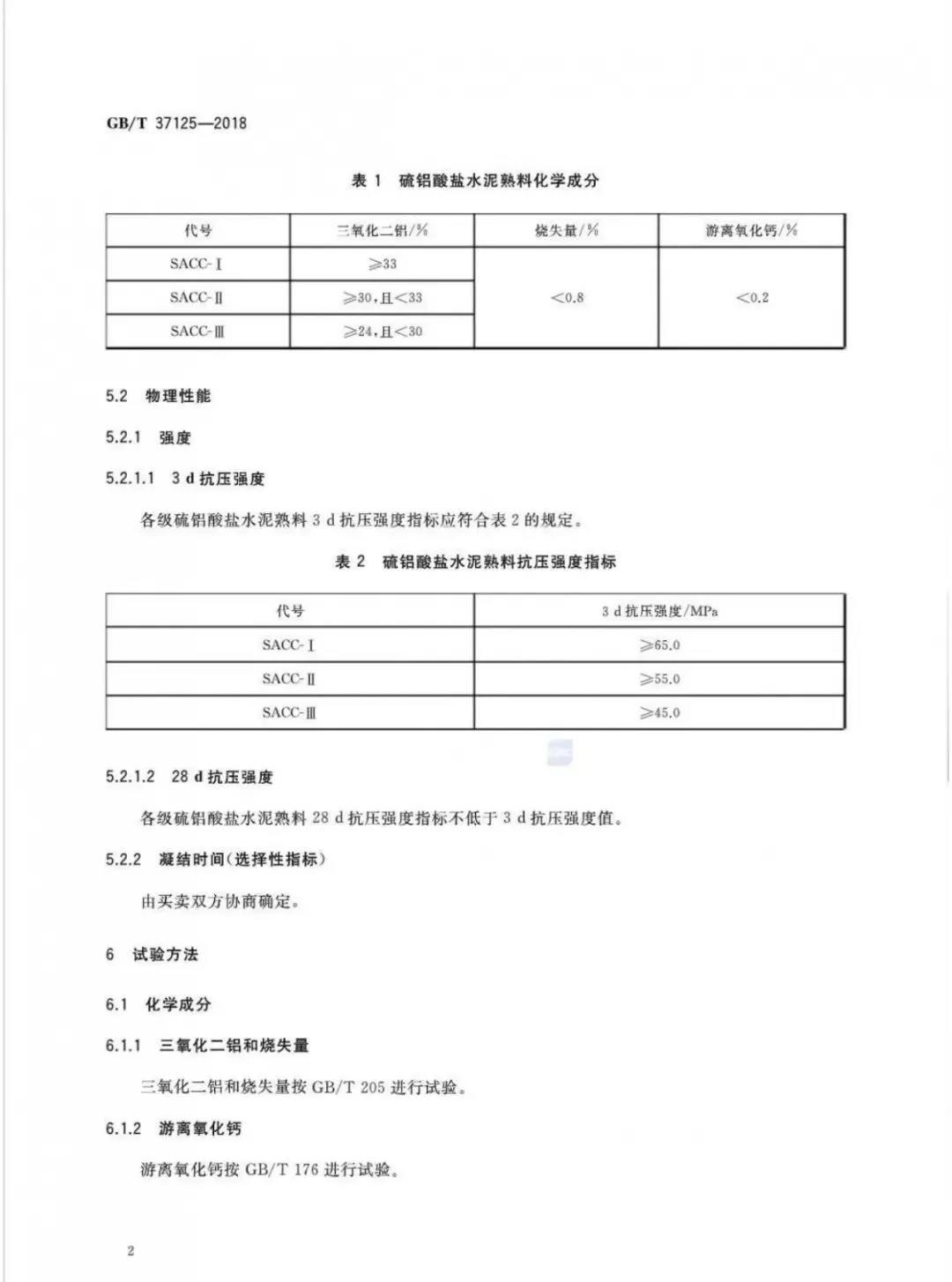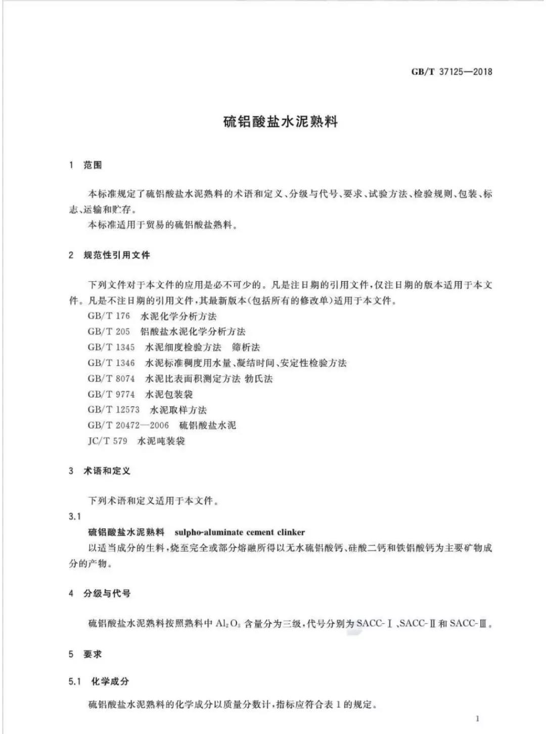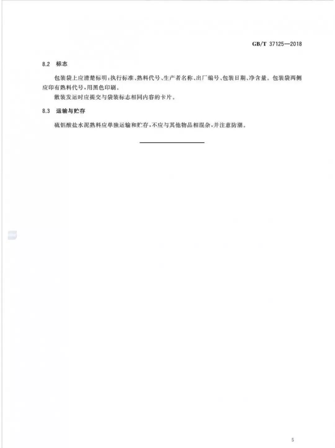 水泥人網(wǎng)消息:于2018年12月28日發(fā)布的GB∕T 37125-2018《硫鋁酸鹽水泥熟料》標(biāo)準(zhǔn)將于2019年11月1日開始實施。該標(biāo)準(zhǔn)適用于貿(mào)易的硫鋁酸鹽熟料,規(guī)定了硫鋁酸鹽水泥熟料的術(shù)語和定義、分級與代號、要求、試驗方法、檢驗規(guī)則、包裝、標(biāo)志、運(yùn)輸和貯存。