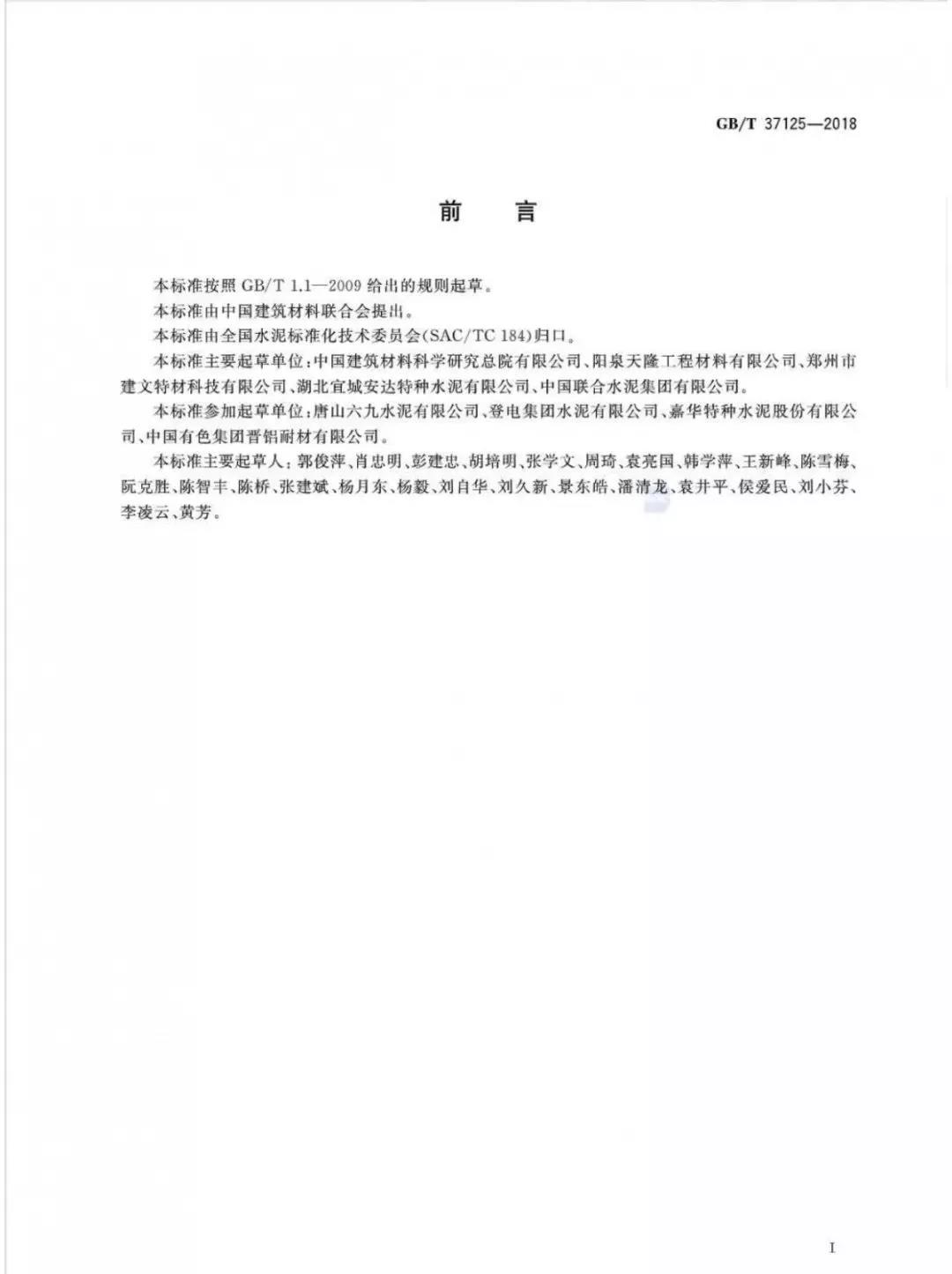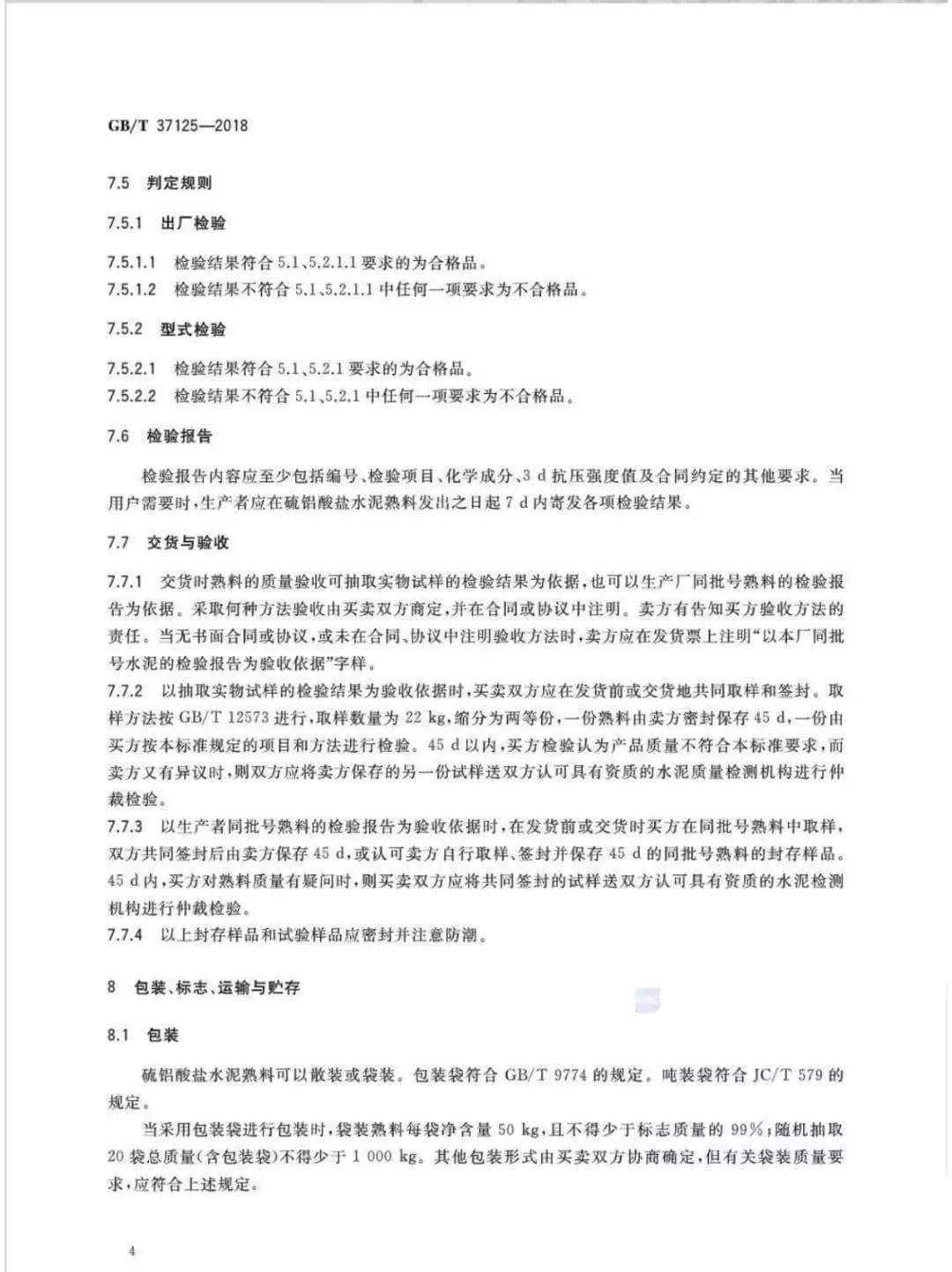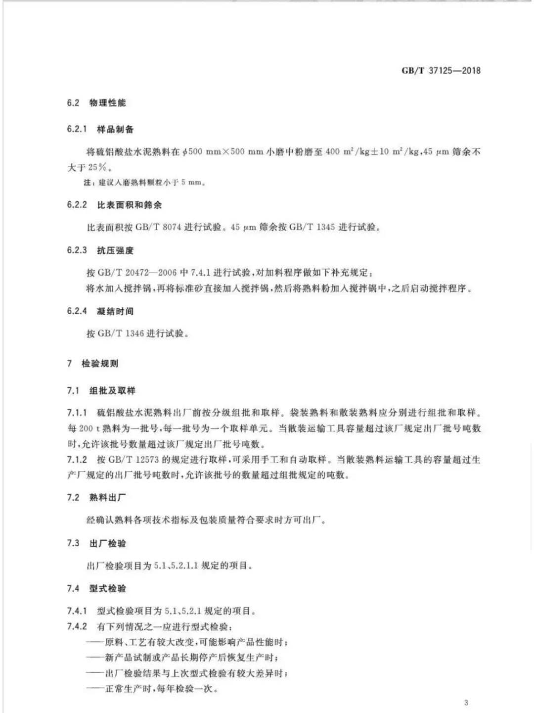 水泥人網(wǎng)消息:于2018年12月28日發(fā)布的GB∕T 37125-2018《硫鋁酸鹽水泥熟料》標(biāo)準(zhǔn)將于2019年11月1日開始實施。該標(biāo)準(zhǔn)適用于貿(mào)易的硫鋁酸鹽熟料,規(guī)定了硫鋁酸鹽水泥熟料的術(shù)語和定義、分級與代號、要求、試驗方法、檢驗規(guī)則、包裝、標(biāo)志、運(yùn)輸和貯存。
