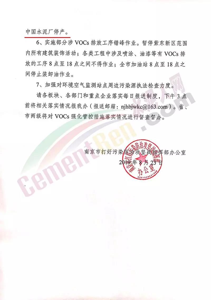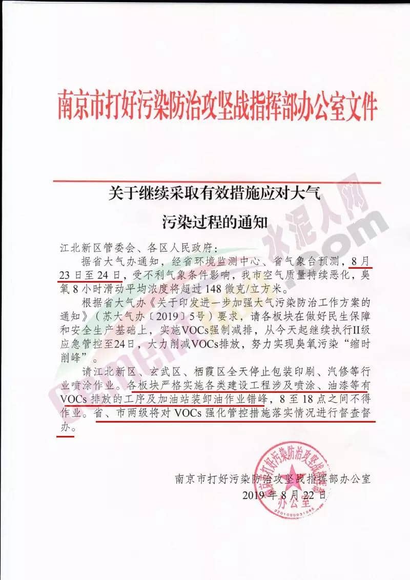 據(jù)水泥人網(wǎng)了解,就在前一日(8月22日),南京市打好污染防治攻堅(jiān)戰(zhàn)指揮部辦公室發(fā)布《關(guān)于繼續(xù)采取有效措施應(yīng)對(duì)大氣污染過(guò)程的通知 》稱據(jù)省大氣辦通知,經(jīng)省環(huán)境監(jiān)測(cè)中心、省氣象臺(tái)預(yù)測(cè),8月23日至24日,受不利氣象條件影響,市空氣質(zhì)量持續(xù)惡化,臭氧8小時(shí)滑動(dòng)平均濃度將超過(guò)148微克/立方米。根據(jù)省大氣辦《關(guān)于印發(fā)進(jìn)一步加在氣污染防治工作方案的通知》要要求,請(qǐng)各板塊在做好民生保障和安全生產(chǎn)基礎(chǔ)上實(shí)施強(qiáng)制減排,從22日起繼續(xù)執(zhí)行II級(jí)應(yīng)急管控至24日,努力實(shí)現(xiàn)臭氧污染“縮時(shí)削峰”。省、市兩級(jí)將對(duì)強(qiáng)化管控措施落實(shí)情況進(jìn)行督查。