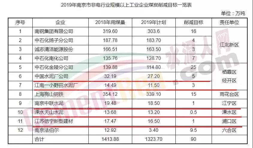2019年南京市非電行業(yè)規(guī)模以上工業(yè)企業(yè)煤炭削減目標(biāo)一覽表中所列企業(yè)包括中國(guó)水泥廠、江南-小野田、南京中聯(lián)水泥、江蘇信寧新型建材、溧水天山水泥等水泥企業(yè)