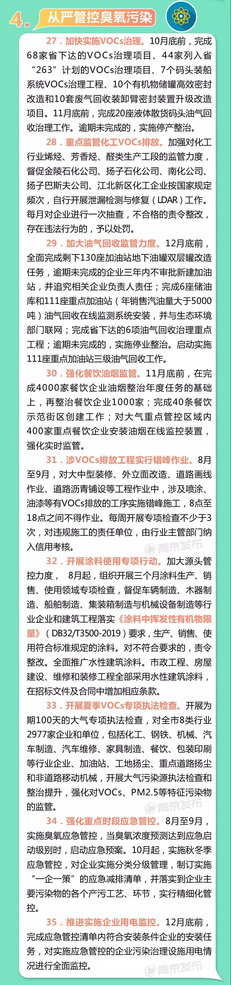 8月9日,南京市出臺(tái)《2019年下半年南京市大氣污染防治攻堅(jiān)措施》堅(jiān)持“能用盡用、能快則快、能實(shí)必實(shí)、能嚴(yán)盡嚴(yán)”的原則,針對(duì)工業(yè)污染、車船污染、揚(yáng)塵污染和臭氧污染4項(xiàng)影響南京空氣質(zhì)量的主要污染源 對(duì)癥下藥制定了40條從嚴(yán)管控措施 。力爭(zhēng)在本年度剩下的月份提升空氣質(zhì)量讓南京人看到更多藍(lán)天。