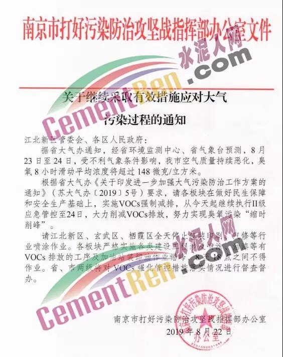 除河南省之外,近日水泥大省江蘇省南京市發(fā)布《關(guān)于繼續(xù)采取有效措施應(yīng)對大氣污染過程的通知》稱,根據(jù)江蘇省大氣辦《關(guān)于印發(fā)進一步加強大污染防治工作方案的通知》要求,各板塊在做好民生保障和安全生產(chǎn)的基礎(chǔ)上,從8月22日起繼續(xù)執(zhí)行II級應(yīng)管控至24日,努力實現(xiàn)臭氧污染“縮時削峰”。
