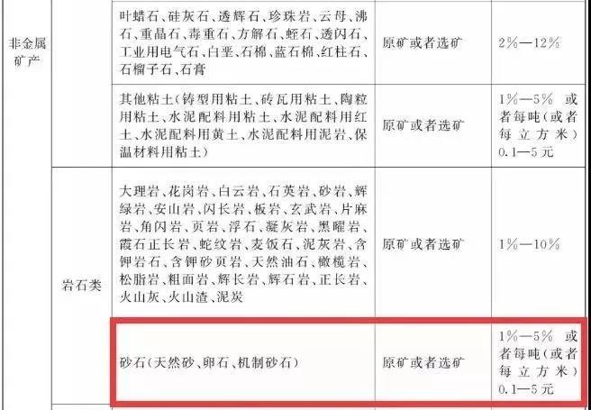據(jù)此前《中華人民共和國資源稅法(征求意見稿)》透露內(nèi)容顯示:對(duì)砂石(天然砂、卵石、機(jī)制砂石)征收1%-5%或者1元-10元/立方米資源稅。稅法規(guī)定對(duì)衰竭期礦山開采的礦產(chǎn)品減征30%資源稅,授權(quán)各省對(duì)低品位礦減免資源稅。