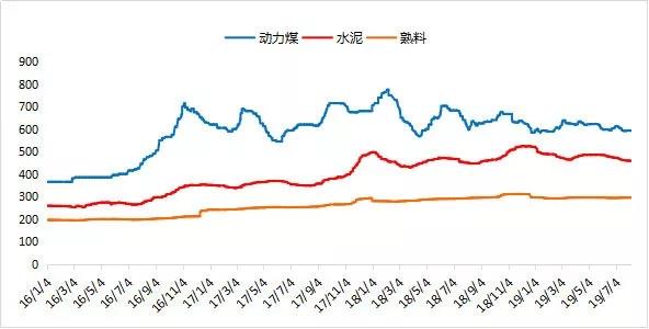 圖2:國(guó)內(nèi)動(dòng)力煤、熟料、水泥價(jià)格走勢(shì)圖(單位:元/噸)