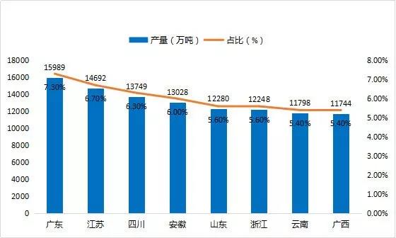 從圖4國(guó)內(nèi)來(lái)看,國(guó)內(nèi)水泥和熟料產(chǎn)量增速區(qū)域特點(diǎn)主要呈現(xiàn)“南部略強(qiáng),北部偏弱”的特點(diǎn),從區(qū)域劃分來(lái)看,國(guó)內(nèi)水泥生產(chǎn)主要分布在華東、中南、西南三個(gè)區(qū)域,其中華東地區(qū)占比最大。分省市來(lái)看,2018年國(guó)內(nèi)水泥生產(chǎn)前八大省市為廣東、江蘇、四川、安徽、山東、浙江、云南、廣西,其中廣東省2018年產(chǎn)量最高為15989萬(wàn)噸,占比7.3%,江蘇、四川緊隨其后,分別占比6.7%、6.3%。