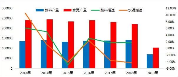 2019年上半年,國(guó)內(nèi)熟料總產(chǎn)量7.1億噸,水泥總產(chǎn)量10.45億噸,同比增長(zhǎng)4.8%,水泥產(chǎn)量增速創(chuàng)出近6年來(lái)同期新高。從以上數(shù)據(jù)來(lái)看,預(yù)計(jì)2019年全年熟料和水泥總量或?qū)⑴c2018年持平。
