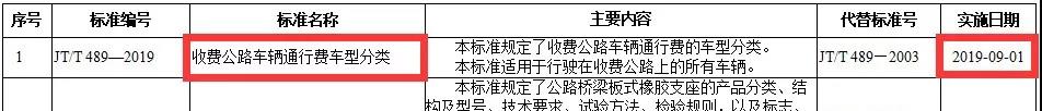關(guān)于《收費公路車輛通行費車型分類》行業(yè)標(biāo)準(zhǔn)的實施時間方面,交通運(yùn)輸部文件附件明確實施日期:2019年9月1日。