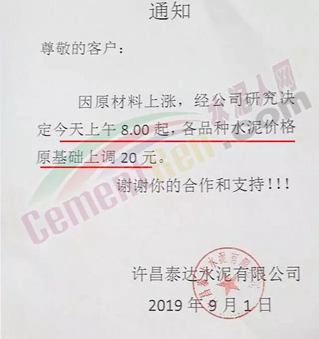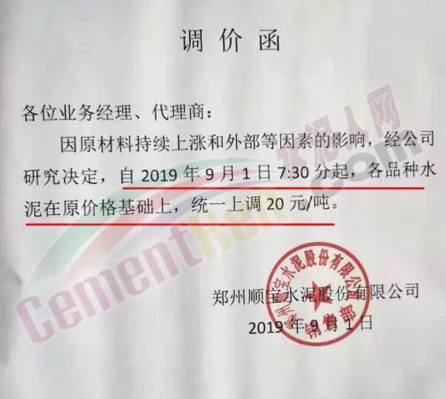 鄭州順寶水泥股份有限公司調(diào)價函稱:因原材料持續(xù)上漲和外部等因素影響,經(jīng)公司研究決定,自2019年9月1日7:30起,各品種水泥在原價格基礎(chǔ)上,統(tǒng)一上調(diào)20元/噸。