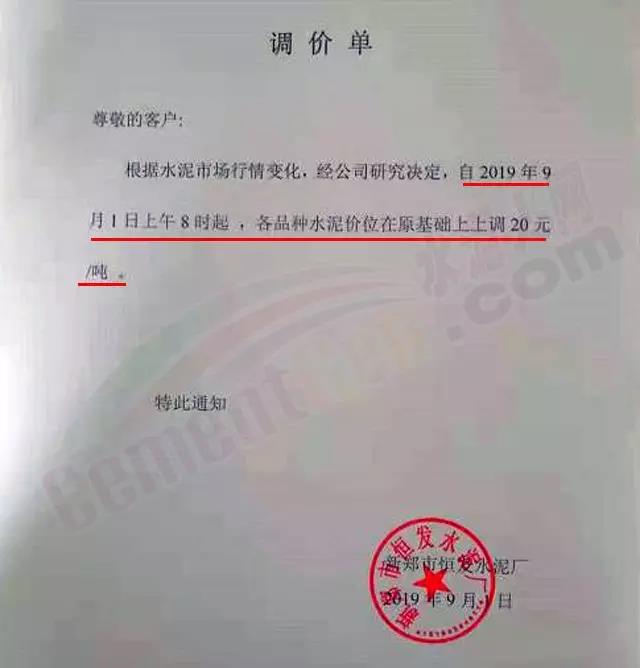 新鄭市恒發(fā)水泥廠調(diào)價單稱:根據(jù)水泥市場行情變化,經(jīng)公司研究決定,自2019年9月1日上午8時起,各品種水泥價位在原基礎(chǔ)上上調(diào)20元/噸。