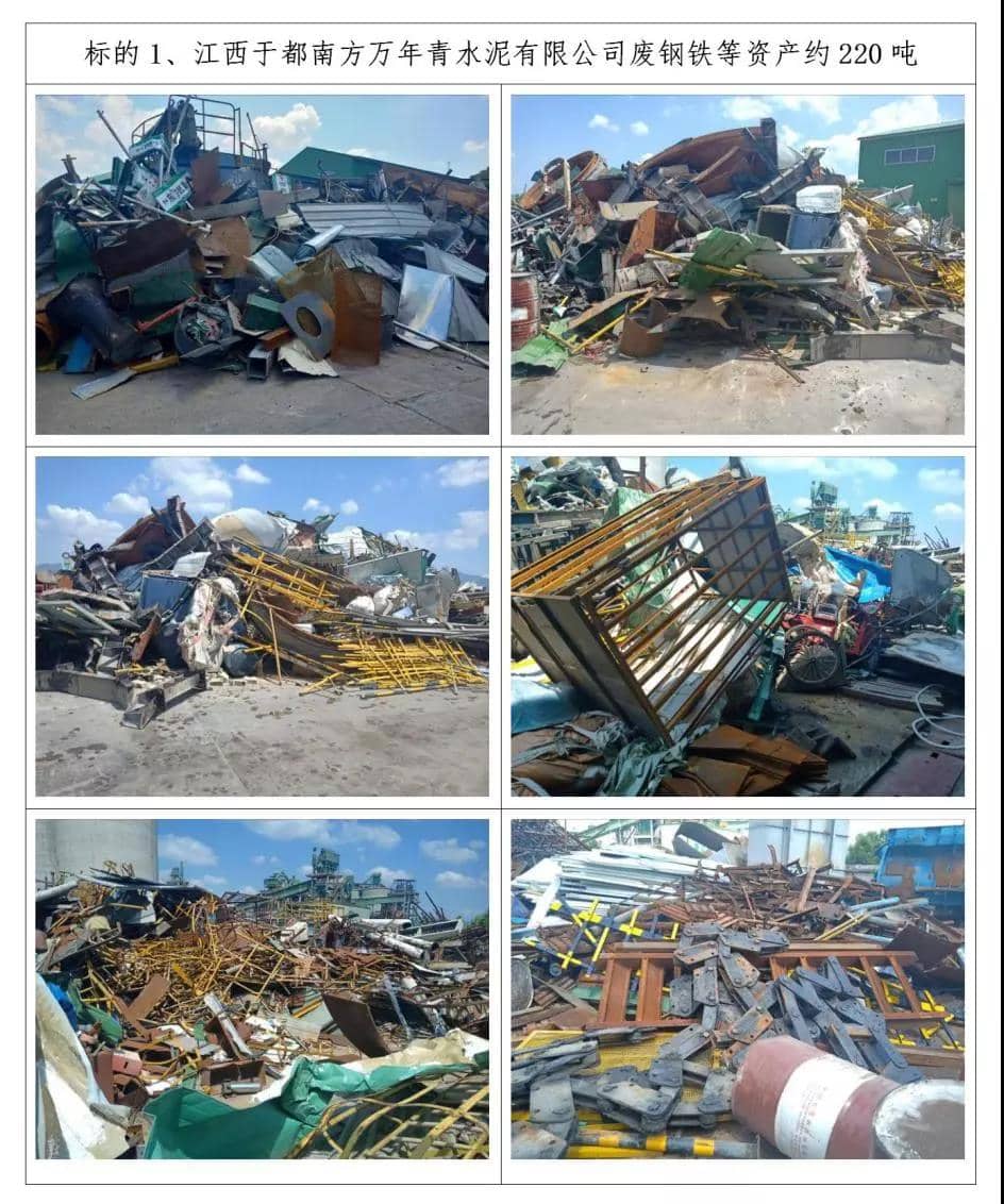 標(biāo)的1:江西于都南方萬年青水泥有限公司擁有的廢鋼鐵等資產(chǎn)約220噸,起拍價(jià)1700元/噸。