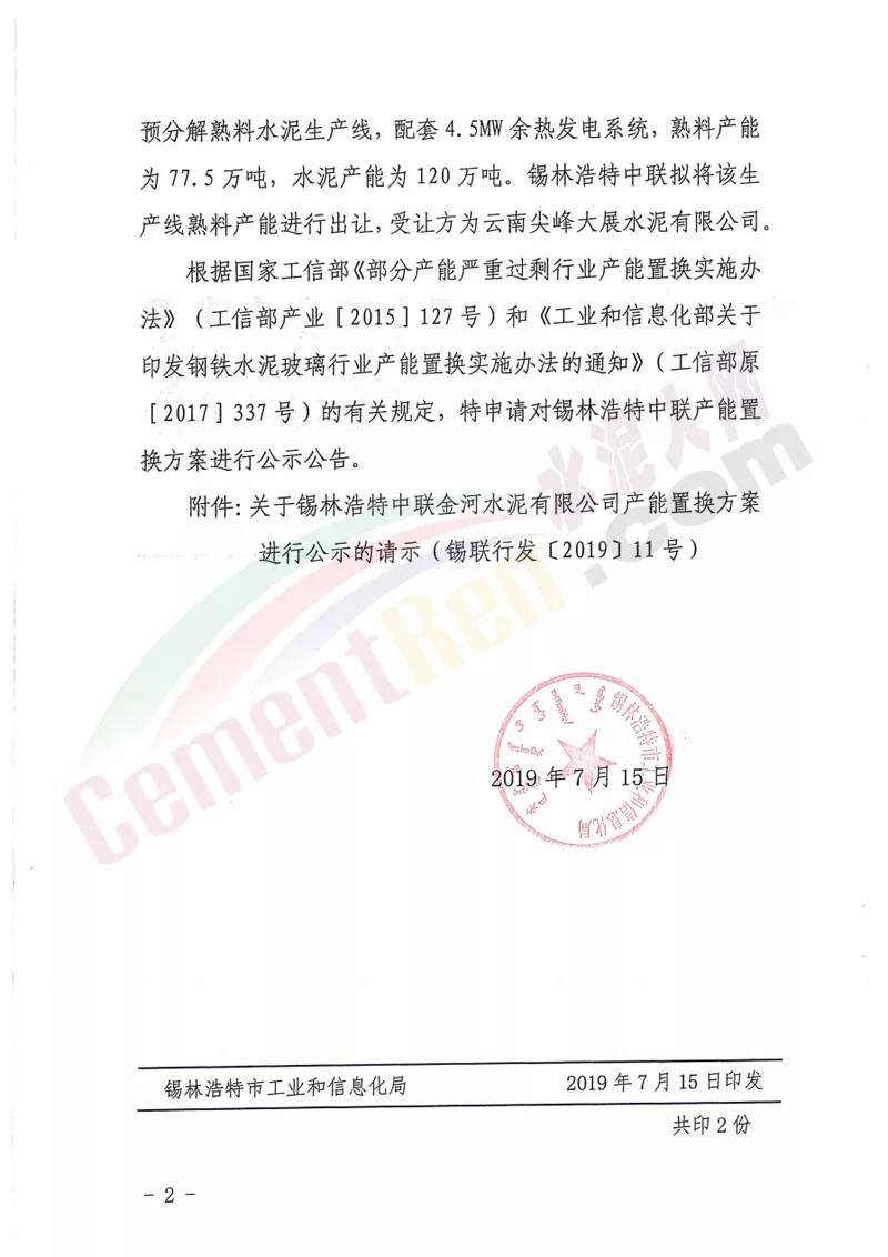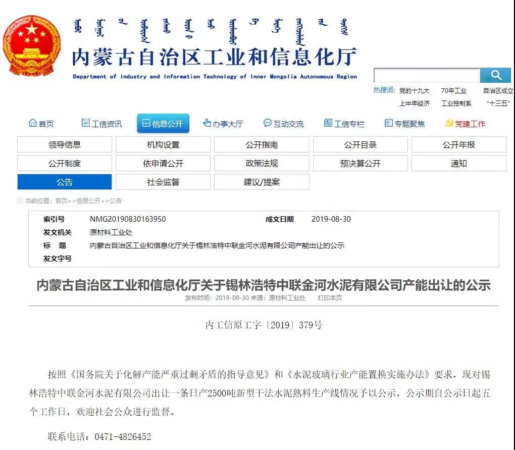 日前,內(nèi)蒙古自治區(qū)工信廳發(fā)布《關(guān)于錫林浩特中聯(lián)金河水泥有限公司產(chǎn)能出讓的公示》稱(chēng),按照《國(guó)務(wù)院關(guān)于化解產(chǎn)能?chē)?yán)重過(guò)剩矛盾的指導(dǎo)意見(jiàn)》和《水泥玻璃行業(yè)產(chǎn)能置換實(shí)施辦法》要求,對(duì)錫林浩特中聯(lián)金河水泥有限公司出讓一條日產(chǎn)2500噸新型干法水泥熟料生產(chǎn)線情況予以公示,公示期自公示日起五個(gè)工作日,并歡迎社會(huì)公眾進(jìn)行監(jiān)督。公示原文如下: