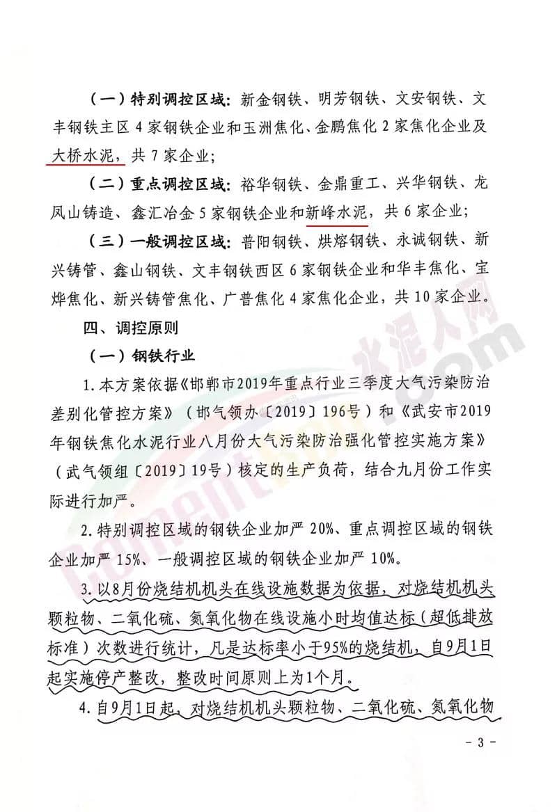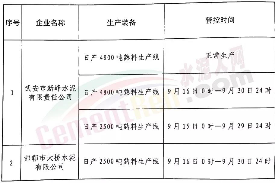 針對(duì)于水泥行業(yè)的調(diào)控原則為,在《邯鄲市2019年重點(diǎn)行業(yè)三季度大氣 污染防治差別化管理方案》核定的生產(chǎn)負(fù)荷基礎(chǔ)上進(jìn)行加嚴(yán),其中新峰水泥、大橋水泥2家企業(yè)各加嚴(yán)10%。