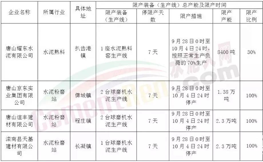 同期,唐山市相關(guān)部門發(fā)布通知稱根據(jù)氣象部門預(yù)測(cè),9月2日20時(shí)至7日12時(shí)唐山市以偏東風(fēng)為主,風(fēng)力偏弱,夜間伴有5-6℃逆溫,整體擴(kuò)散條件差。為降低污染傳輸影響,在嚴(yán)格落實(shí)9月份強(qiáng)化管控措施基礎(chǔ)上,9月2日18時(shí)至7日12時(shí)期間,執(zhí)行管控措。要求水泥行業(yè)企業(yè)一條水泥窯企業(yè)限產(chǎn)40%;兩條及以上水泥窯企業(yè)停一條水泥窯生產(chǎn)線。