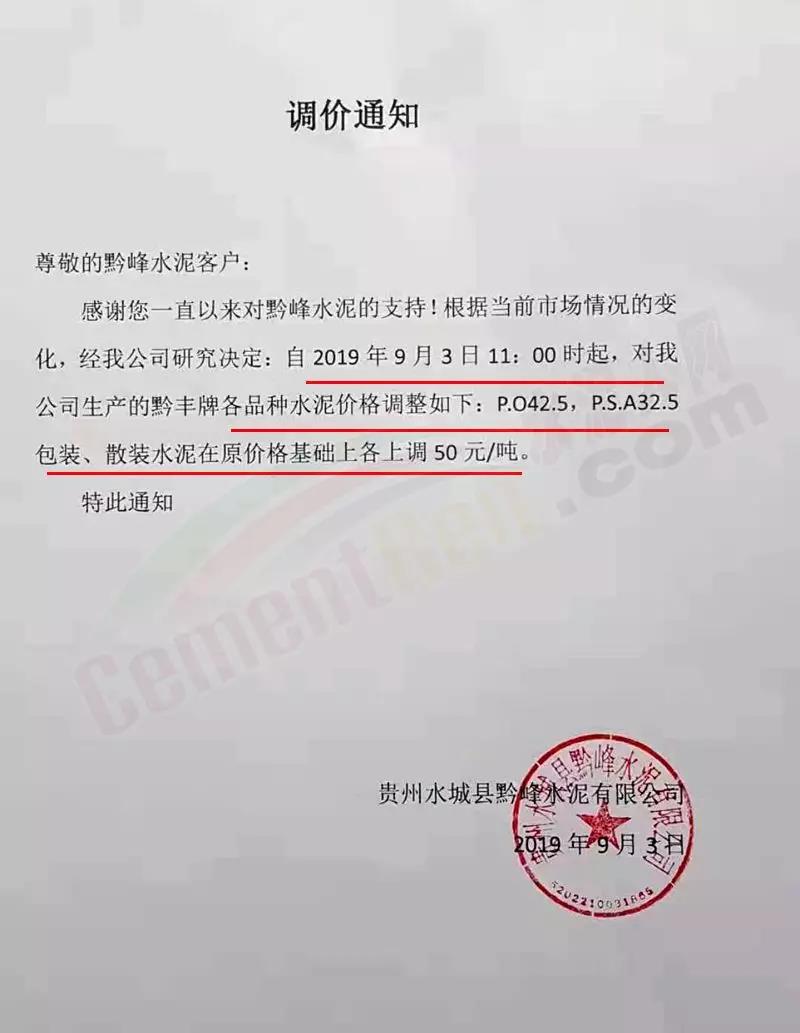 貴州六盤水豪龍水泥有限公司調(diào)價通知稱根據(jù)市場變化自9月2日8時起上調(diào)水泥價格,上調(diào)幅度50元/噸。