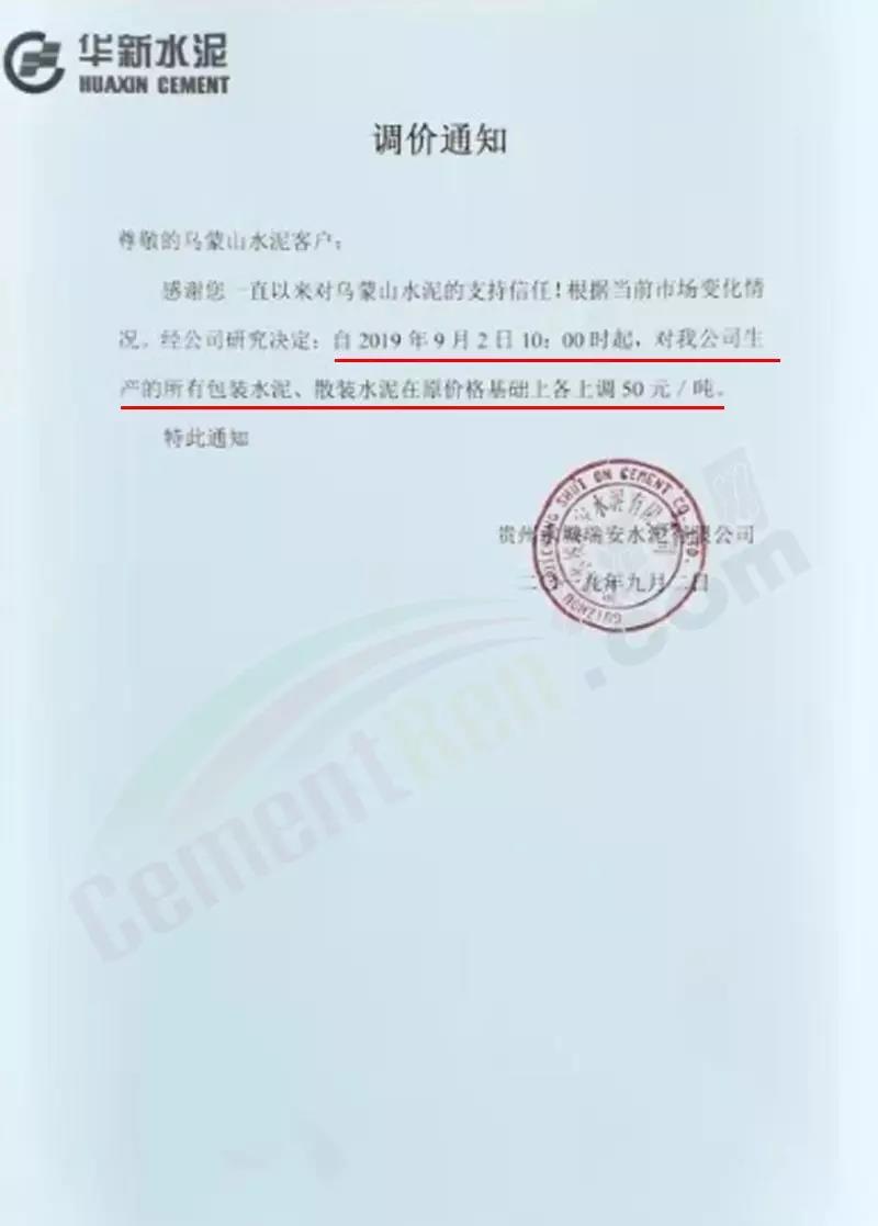 華新水泥調(diào)價通知稱,自9月2日10時起上調(diào)各標號水泥價格,上調(diào)幅度50元/噸。