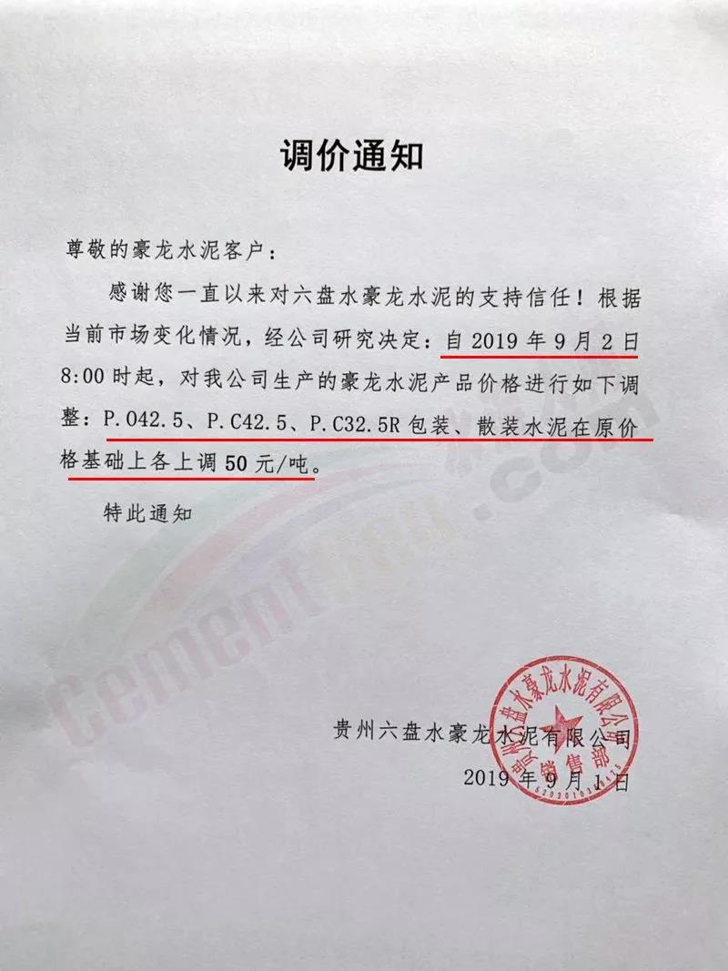 經(jīng)公司研究決定,自2019年09月01日0:00時(shí)起,各品種等級袋裝水泥在原價(jià)格基礎(chǔ)上每噸上調(diào)20元。敬請知悉。