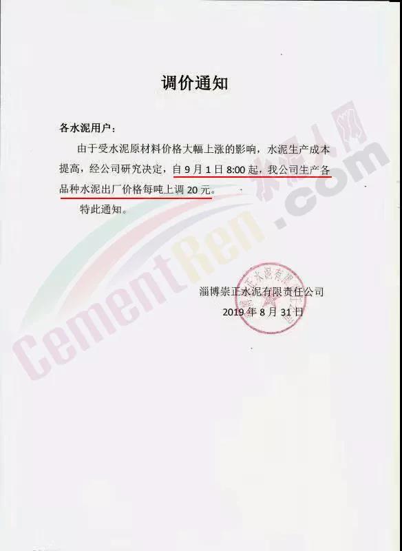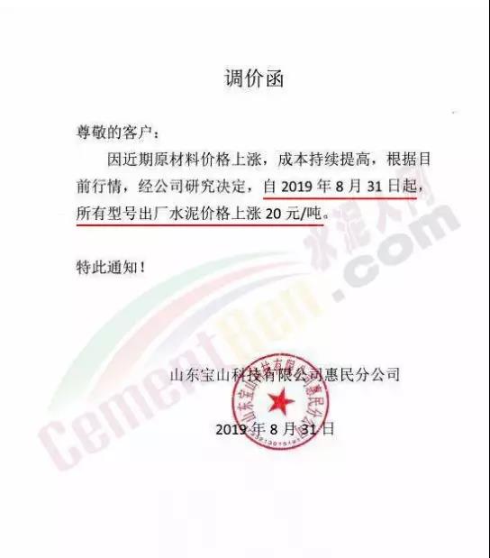 鄭州順寶水泥股份有限公司調(diào)價(jià)函稱:因原材料持續(xù)上漲和外部等因素影響,經(jīng)公司研究決定,自2019年9月1日7:30起,各品種水泥在原價(jià)格基礎(chǔ)上,統(tǒng)一上調(diào)20元/噸。