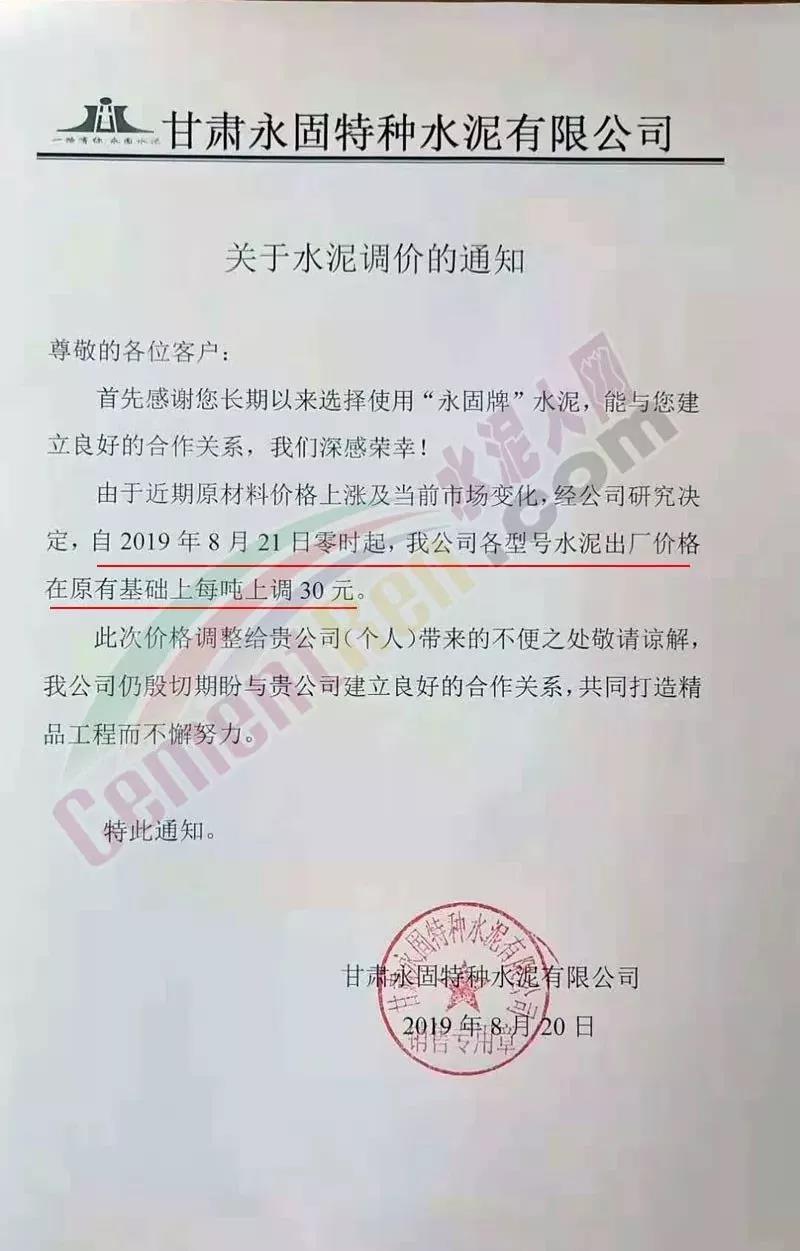 甘肅永固特種水泥有限公司《關(guān)于水泥調(diào)價(jià)的通知》稱,由于近期原材料價(jià)格上漲及當(dāng)前市場變化 ,經(jīng)公司研究決定 自8月21日零時(shí)起,公司各型號水泥出廠價(jià)格在原有基礎(chǔ)上每噸上調(diào)30元/噸。